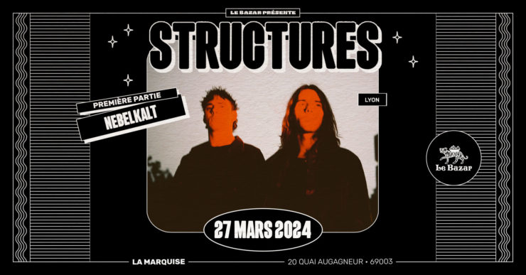 Structures, c’est du rock taillé pour les grandes scènes qui sait se faire intime, qui assume sa noirceur comme sa lumière, ses hurlements comme son élégance. Entre New Wave, Rock Alternatif et Industriel, Pierre et Marvin forment un duo qui nous attire à eux comme un aimant et nous secoue de ses convulsions.“A Place For My Hate”, un premier album bâti pour le live, est une déclaration à ce qui nous sauve d’une société hideuse et injuste : l’amour.